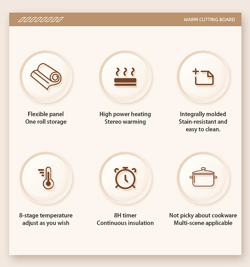 【Adjustable 8-Level Temperature Control】raugee silicone electric heating tray providing 8 temperature levels from 50 to 120℃, meeting various needs such as keeping food warm, defrost, etc., making it convenient for you to efficiently prepare meals and enjoy precise temperature adjustment for heating and keeping food warm , perfect for buffets, parties, and gatherings.